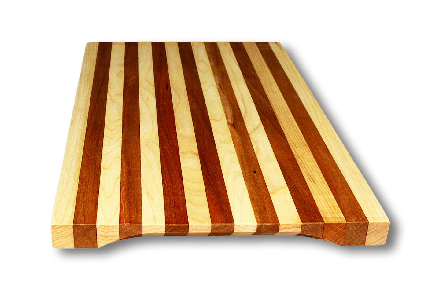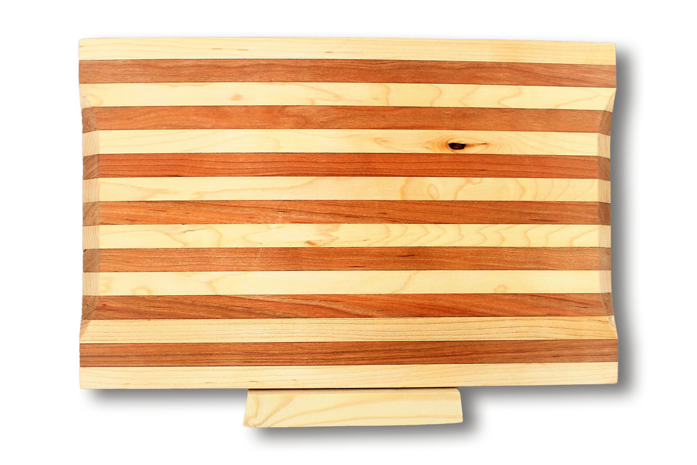Mit BRUNO unserem Servier- und Schneidebrett zieht ein echter Hingucker in die Küche ein. Das nicht nur formschöne sondern auch praktische Holzbrett ist vielfältig einsetzbar, ob als Käseplatte oder zum Gemüseschnippeln. Die Massivholzleisten aus Kirsche und Ahorn werden von Hand stabverleimt, dadurch erhält das Schneidebrett sein unverwechselbares Design. Um die kontrastreichen Hölzer besser zur Wirkung kommen zu lassen und zum Schutz des Holzes, wird jedes Brett behutsam per Hand mit Olivenöl behandelt. Zwei eingefräste Griffmulden erleichtern die Handhabung. Das stabile Schneidebrett liegt glatt auf, schont die Messerklingen und ist pflegeleicht.