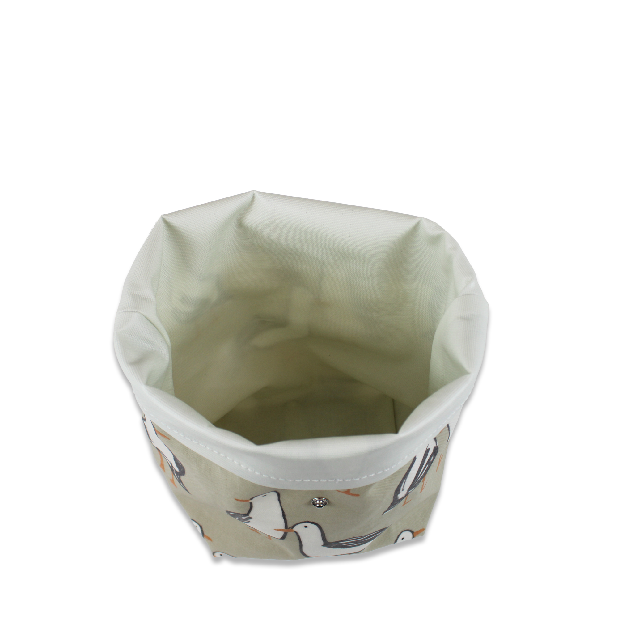 Zwei Druckknöpfe dienen als Verschluss, so lässt sich die Höhe je nach Inhalt variabel anpassen. Von außen und innen schmutz- und wasserabweisend ist die Tasche ganz leicht zu reinigen. Die verwendeten Stoffe entsprechen OEKO-TEX® Standard 100. Die Acryl-Beschichtung besteht aus 50% recyceltem Material und wurde hochwertig auf den Stoff laminiert. Er ist für Allergiker geeignet und speziell für den Kontakt mit Lebensmitteln geeignet.