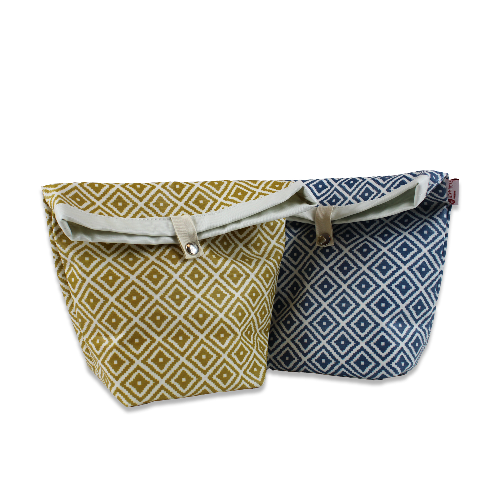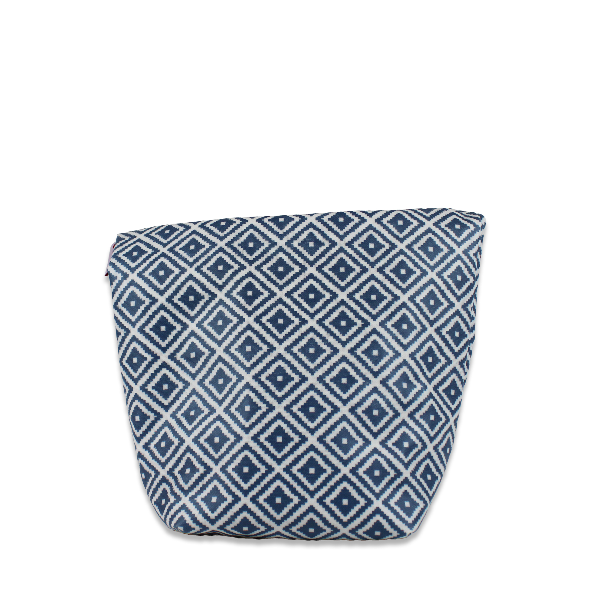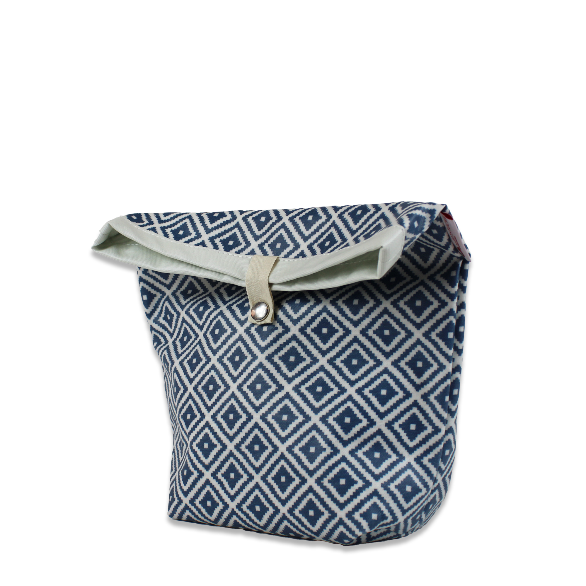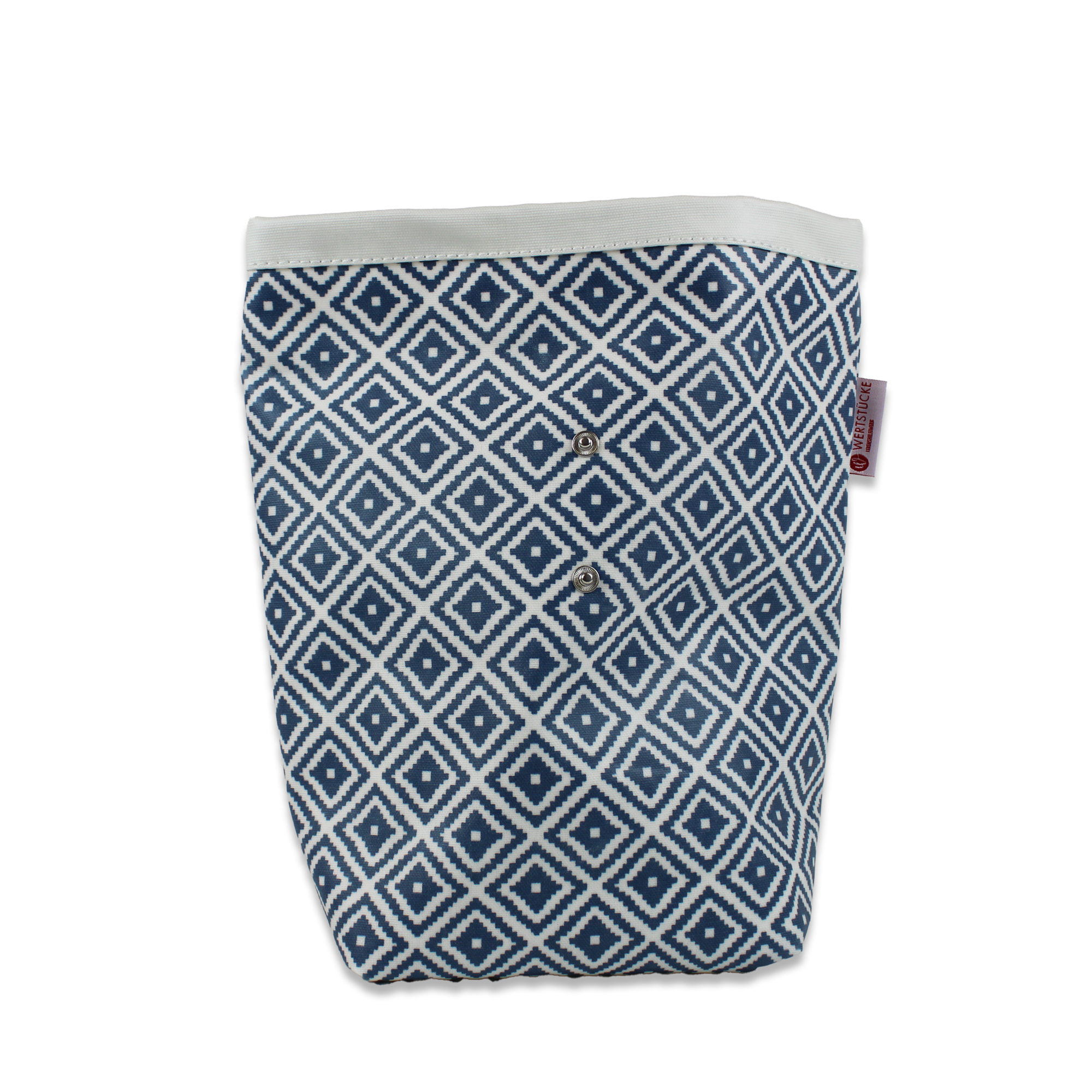 Unsere genähte Lunch-Box KIKI aus robustem Stoff ist richtig praktisch und punktet mit dem grafischen blau-weißen Muster im Inka-Stil optisch gegen jede Allerwelts-Brotdose. Ob fürs Frühstück im Büro oder den Snack auf der Wanderung, KIKI ist universell einsetzbar. Hier passt auch die nasse Badehose oder Kinderspielzeug gut hinein. Zwei Druckknöpfe dienen als Verschluss, so lässt sich die Höhe je nach Inhalt variabel anpassen.