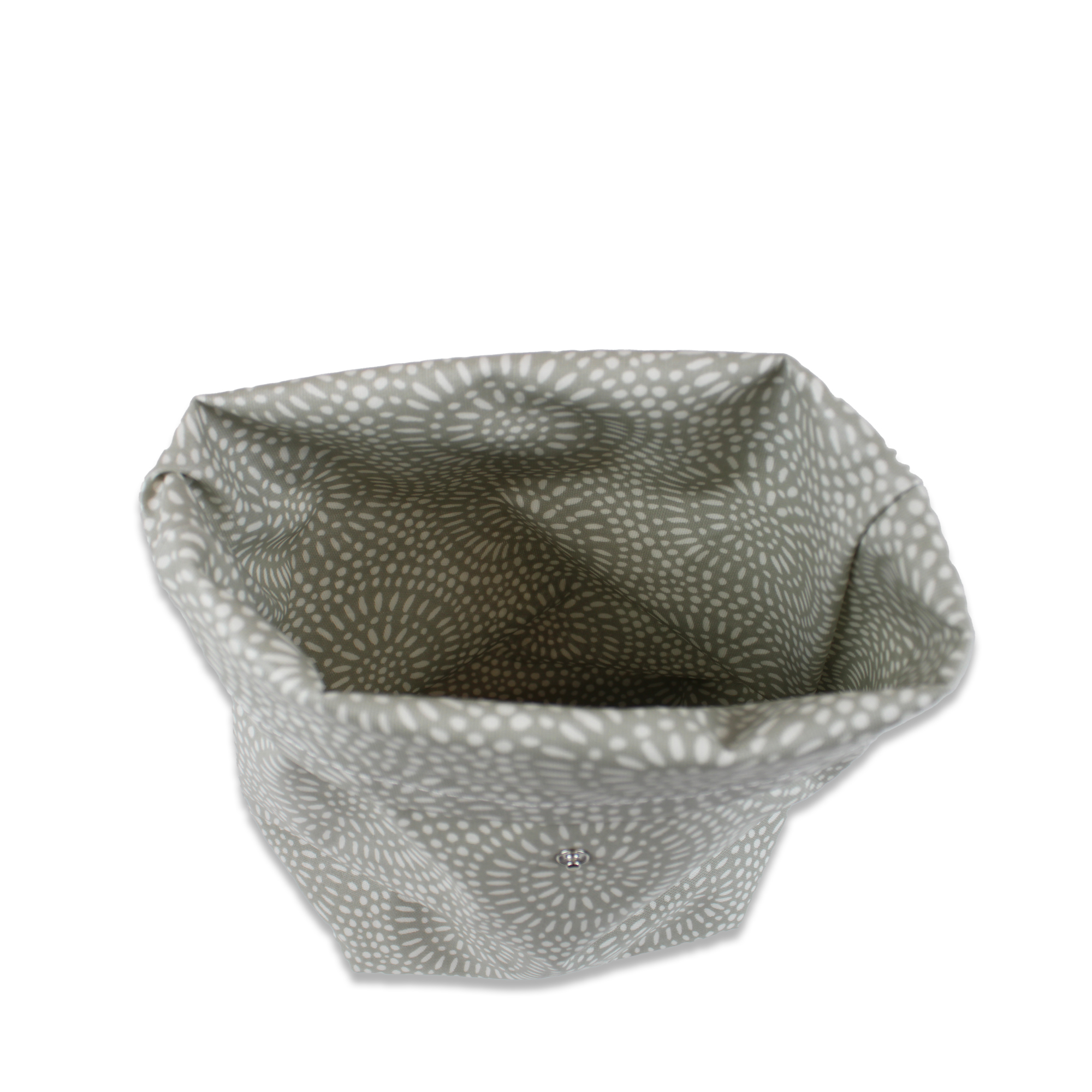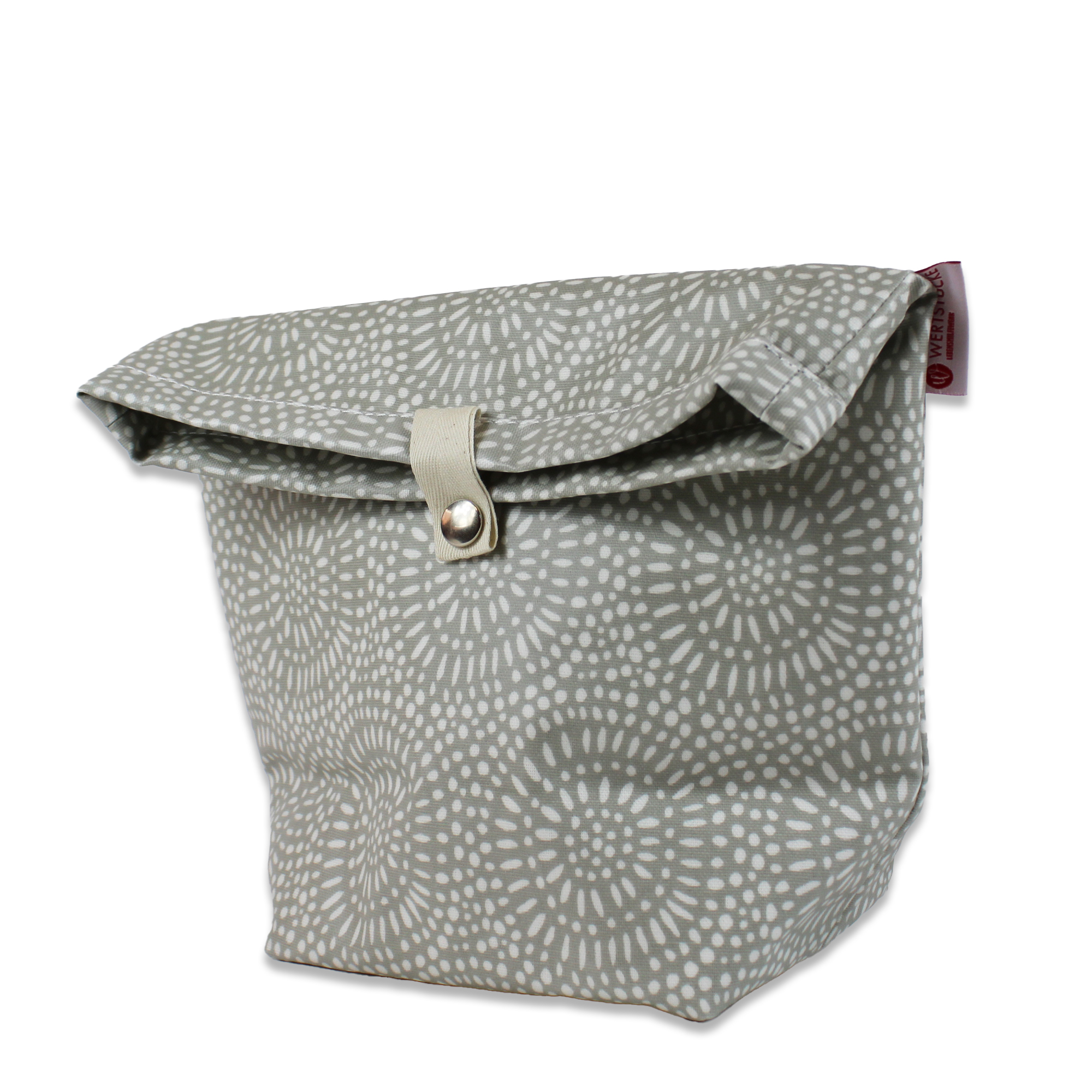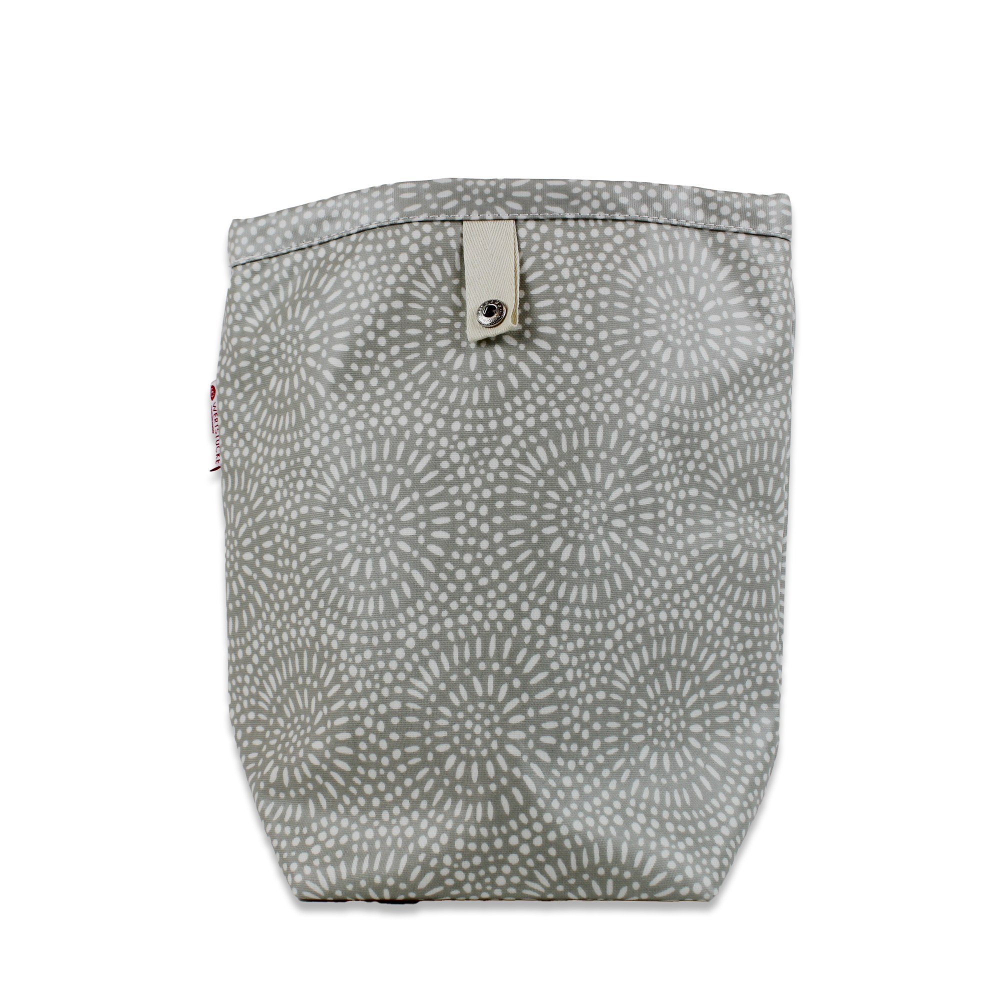 Die grau-weiße Lunch-Box ist platzsparend zusammenlegbar, Verschmutzungen lassen sich ganz einfach feucht abwischen. Zwei Druckknöpfe dienen als Verschluss, so lässt sich die Höhe je nach Inhalt variabel anpassen. Sehr praktisch!