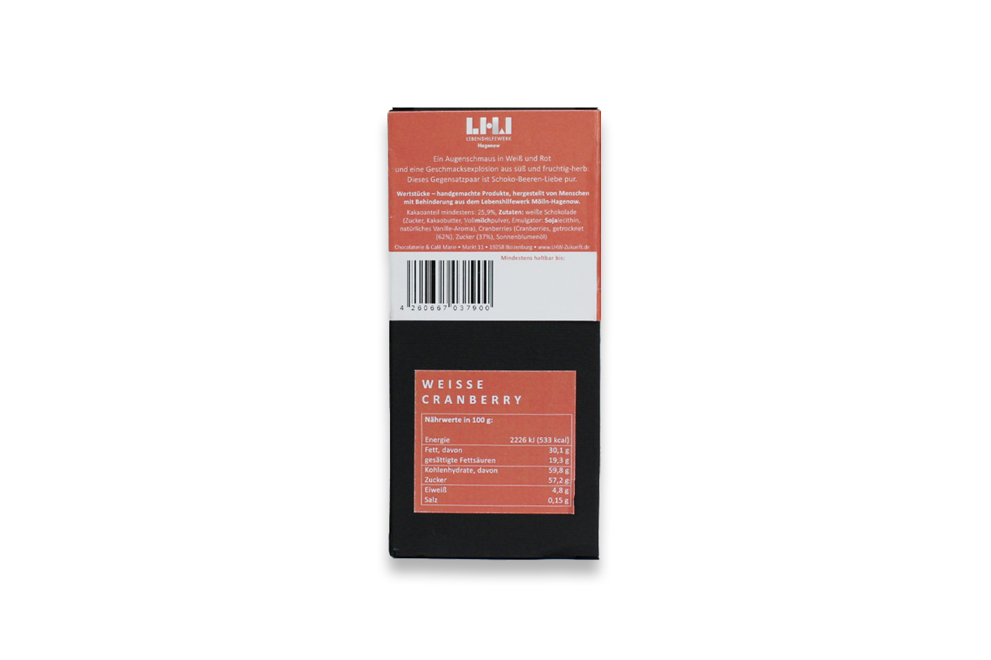 | Zutaten: | Kakaoanteil mind. 25,9 %, weiße Schokolade (Zucker, Kakaobutter, VollMILCHpulver, Emulgator: SOJAlecithin, natürliches Vanille-Aroma), Cranberries (Cranberries, getrocknet (62%), Zucker (37%), Sonnenblumenöl) |